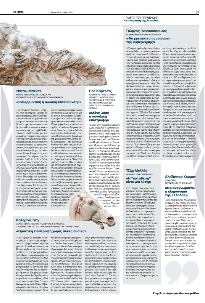 Kathimerimi, Catharine quoted in discussion about the Parthenon Marbles, 3 April 2024