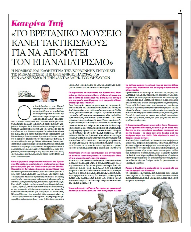 Κατερίνα Τιτή στα «ΝΕΑ»: «Το Βρετανικό Μουσείο κάνει τακτικισμούς για να αποφύγει τον επαναπατρισμό των Γλυπτών» (in Greek) /British Museum using ‘ploy’ to dodge Parthenon Marbles return, Catharine Titi says, English translation here