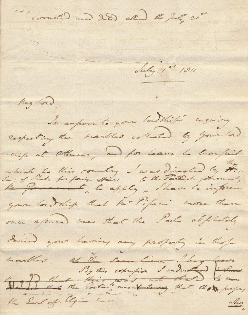 ‘… the Porte absolutely denied your having any property in those marbles.’ Robert Adair’s draft letter to Elgin (31 July 1811). Collection of Theodore Theodorou. Used with permission. For a full transcript, see http://www.adairtoelgin.com.